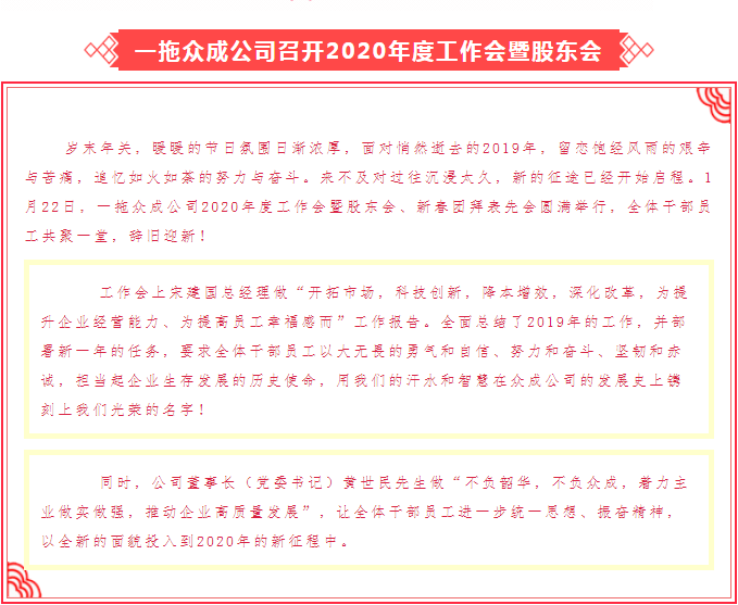 一拖眾成公司召開2020年度工作會暨股東會、新春團(tuán)拜表先會